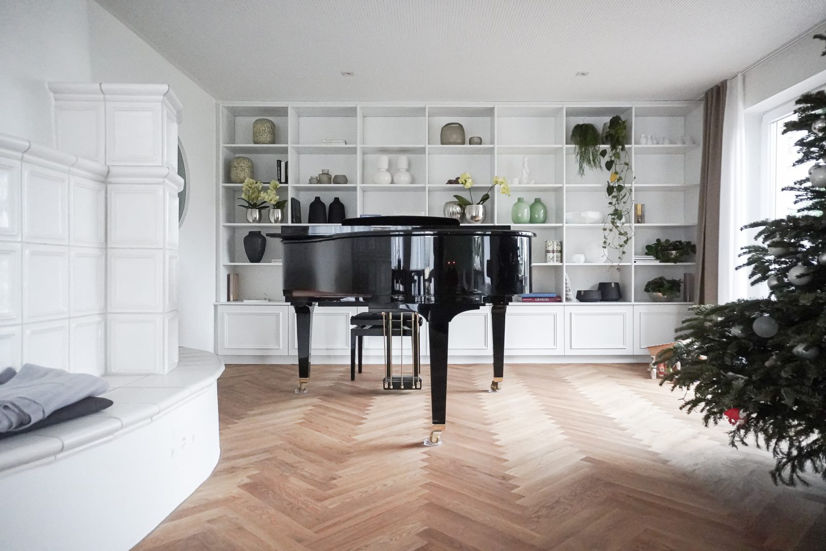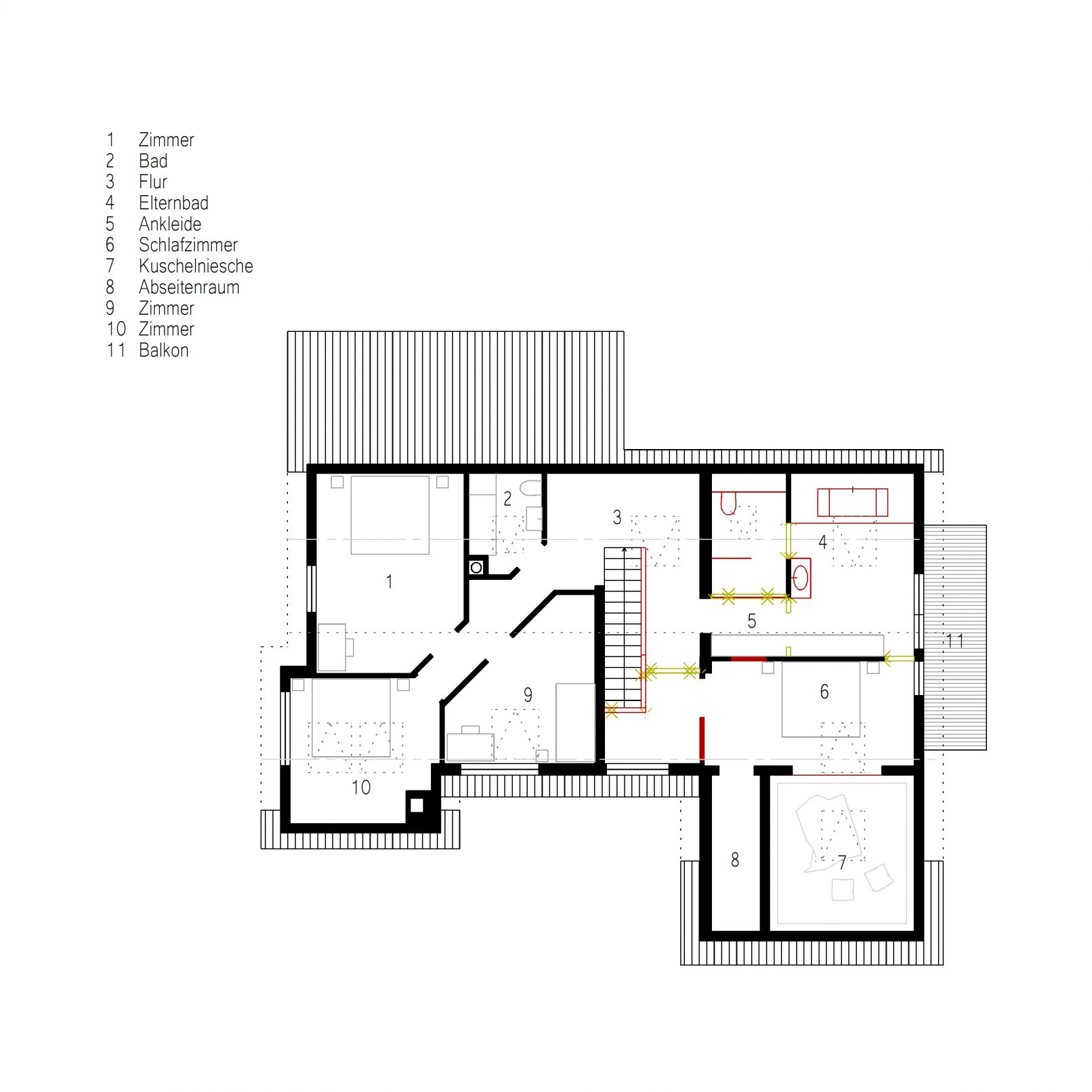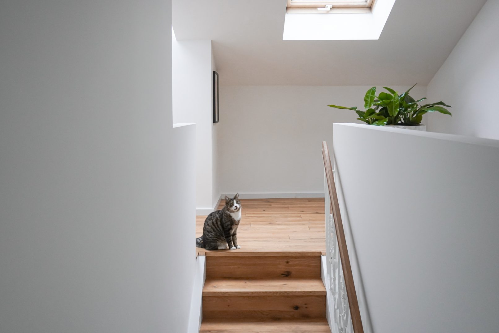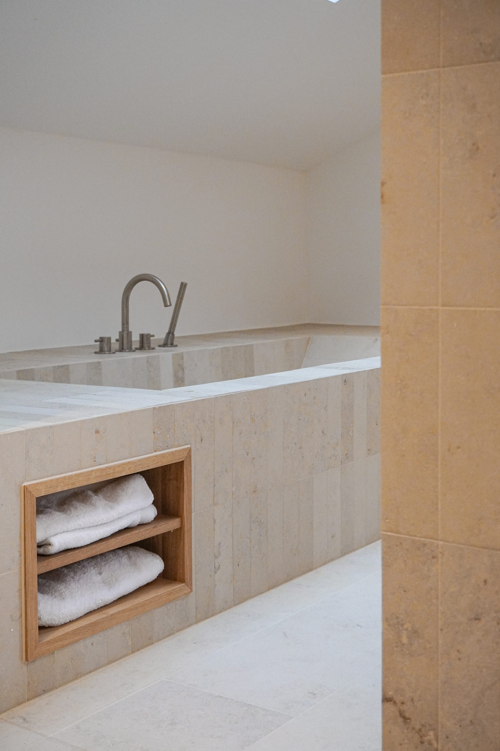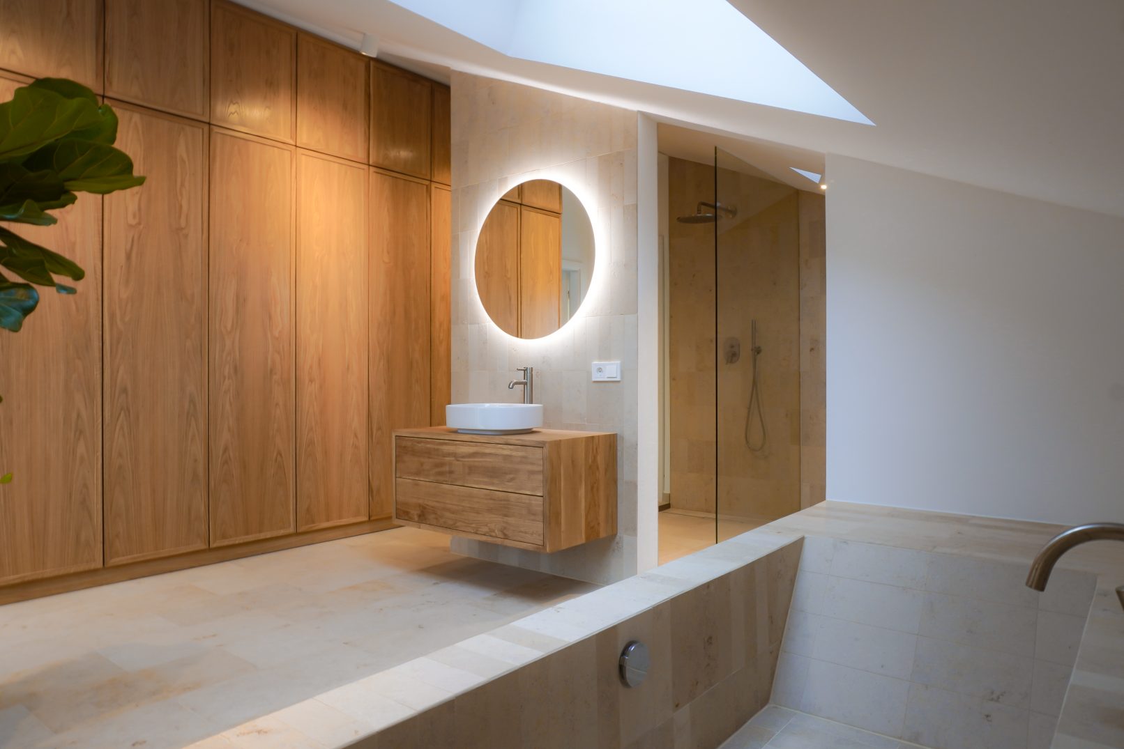 Im Obergeschoss hingegen wurden bereits zuvor veränderte Raumstrukturen wieder rückgebaut. Hierdurch fand ein sehr großzügiges Elternbad mit integrierter Ankleide platz. Auch hier ist das Materialkonzept vorzufinden, Jurakalksteinfliesen im Sanitärbereich und Eichenholzmöbel.